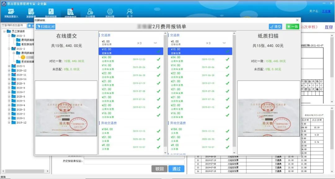 财务将员工提交的报销发票原件或打印件通过票总管发票专用扫描仪批量扫描,实现发票智能审核。在发票审核过程中,票总管即可将APP端的识别结果与财务端识别结果进行自动比对,审核该员工线上线下提交的报销发票张数是否一致、金额是否一致,导致审核不一致的原因、问题发票是哪张等结果均一目了然且支持实时查看。