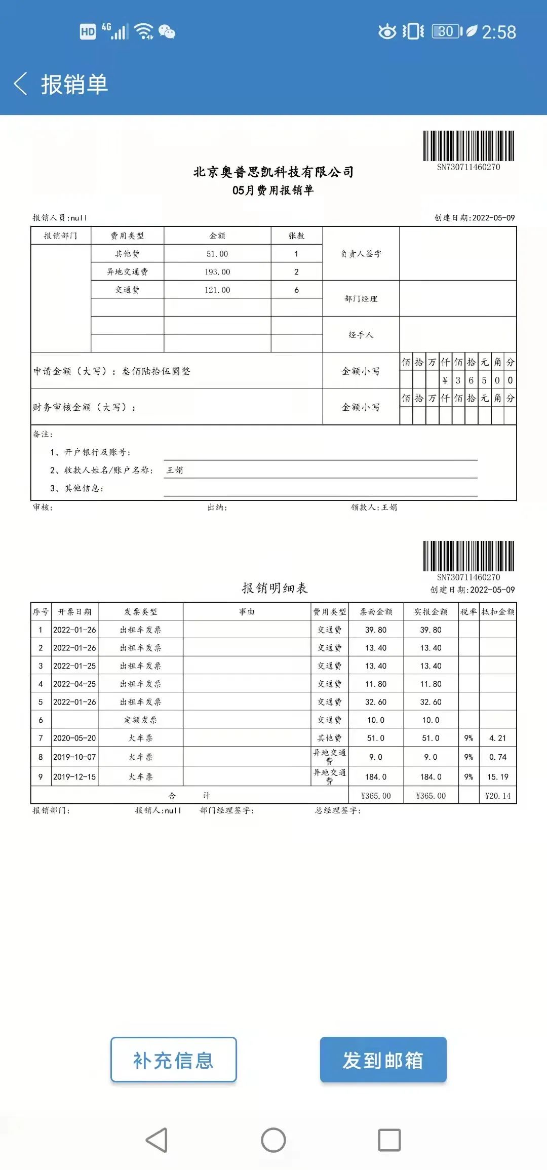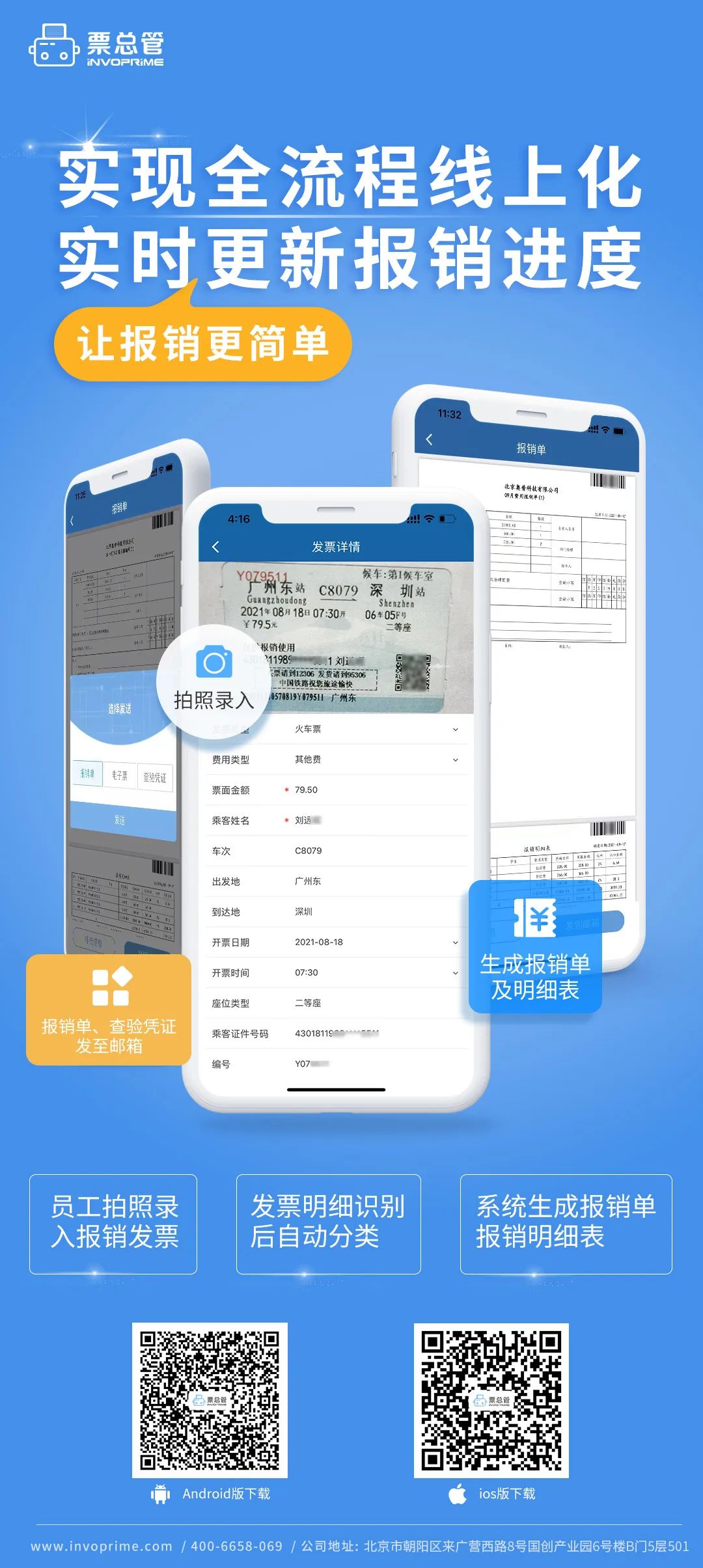 票总管发挥OCR优势,可自动识别核验发票,按费用项目自动分类并计算金额,员工线下使用APP将自动生成的报销单、报销明细表及电子发票一键打印、签字,如果还有纸质发票也一并提交给财务即可。